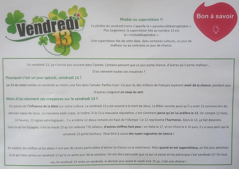 Résidence Tiers Temps > Actualités > Bon à savoir Bon à savoir Publiée le 13/03/2026 "Vendredi 13" phobie ou superstition ?...retrouvons une petite explication ce midi à table !