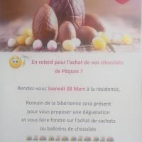 Publiée le 07/03/2026Si vous êtes en retard dans l'achat de vos chocolats de Pâques, pas de panique...Romain de la Sibérienne viendra Samedi 28 Mars à la résidence de 15h à 16h...venez découvrir ses chocolats, les déguster et en acheter si vous le souhaitez ! Lire la suite