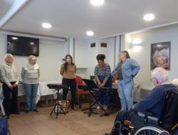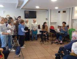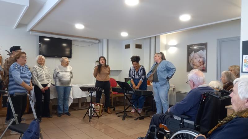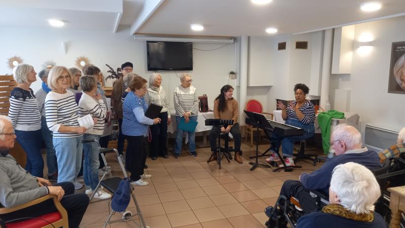 Encore un agréable moment de partage autour du chant ; la chorale de l'association des "chers Voisins" est venue nous présenter son répertoire travaillé avec Clémentine de DEVA (école de musique actuelle d'Aix-les-Bains) et nous, nous leur avons également chanté notre répertoire préparé depuis fin Février avec Fanny, notre nouvelle intervenante.